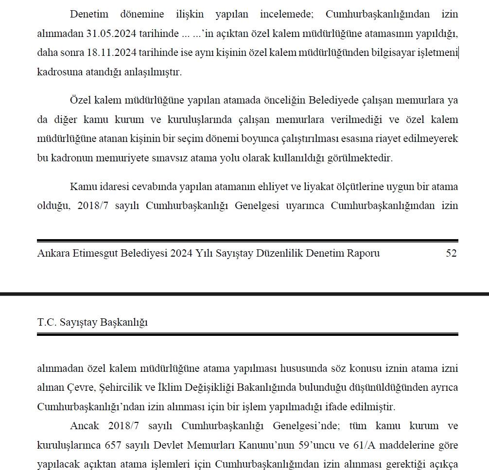 “Denetim dönemine ilişkin yapılan incelemede; Cumhurbaşkanlığından izin alınmadan 31.05.2024 tarihinde … …’in açıktan özel kalem müdürlüğüne atamasının yapıldığı, daha sonra 18.11.2024 tarihinde ise aynı kişinin özel kalem müdürlüğünden bilgisayar işletmeni kadrosuna atandığı anlaşılmıştır.