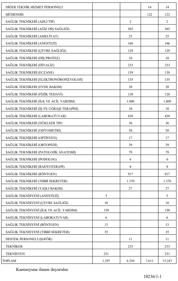 Resmi Gazete’nin bugünkü yayımlanan sayısında yer alan Sağlık Bakanlığının ilanına göre, Bakanlığın merkez ve taşra teşkilatında istihdam edilmek üzere 15 bin 247 sözleşmeli personel, Kamu Personel Seçme Sınavı (KPSS) sonucuna göre ÖSYM tarafından yapılacak merkezi yerleştirmeyle alınacak.